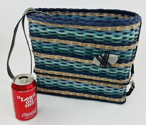 The Lake Superior Basket is the fifth basket in the Great Lakes Series. This basket has a unique pattern with two wood bases. The bottom woven basket is open at one end as a secret place for accessories. Weaving continues up through the second base to give the inside of the basket a second "floor". The shaker tape handle is woven from bottom up, and covers the opening at the side so accessories do not fall out. It has a snap closure. The basket is woven in sand, teal blue, teal green and marine blue. The rim is finished with a beautiful woven braid. Included in the kit is a stone from Lake Superior and it is connected to the basket via rock wrapping.